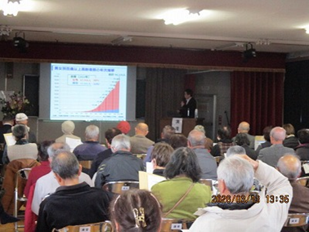 3月13日(金)の午後1時半から、老人大学の二階講堂において、講演会を実施しました。これは、みずほ教育福祉財団助成事業の一環として、年度最後の事業として、女性委員会が企画して行ったものです。講演会は、武田女性委員会委員長の進行で宇根副会長の絶妙な開会あいさつで始まり、招聘した「医師:沖田光昭さん」のおよそ1時間の講演と続きました。要介護にならずに健康寿命を延ばす、そのためには、社会参加への呼びかけ(特に老人クラブへの参加など)の地域力が大事だと強調され、参加された80名余りの方は、内容の満足と新たな認識をお土産に帰路に就かれました。